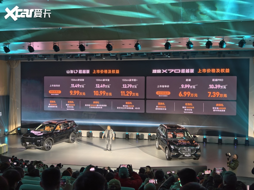 今晚,捷途X70超越版与山海L7超越版两款车型在芜湖正式上市,限时售价分别是6.99-7.39万和9.99-11.29万。两款新车均主打家用大空间SUV 市场,针对不同消费需求打造差异化产品力,而且两款车型都有非常高的性价比,也延续了捷途 “旅行 +” 的品牌定位,进一步丰富了品牌在 10 万级家用 SUV 市场的产品矩阵。